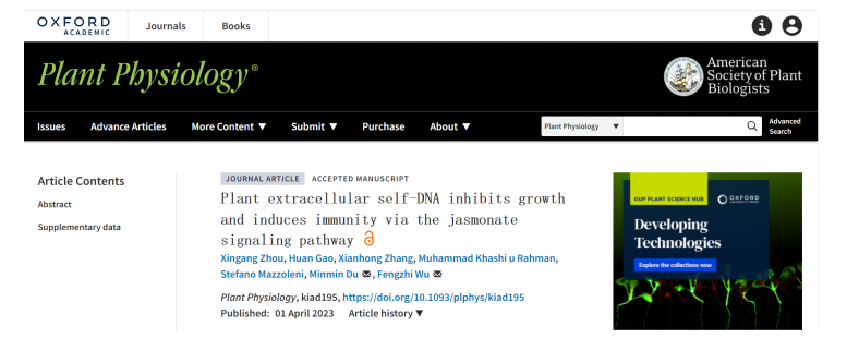 近日,公司U8国际周新刚研究员、吴凤芝教授等在植物esDNA作用机理方面取得重要进展,成果以《Plant extracellular self-DNA inhibits growth and induces immunity via the jasmonate signaling pathway》为题发表于植物科学领域国际权威期刊《Plant Physiology》。该研究揭示了esDNA通过JA途径抑制植物生长并诱导植物免疫反应。(全文链接:https://doi.org/10.1093/plphys/kiad195)。