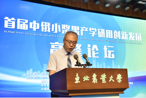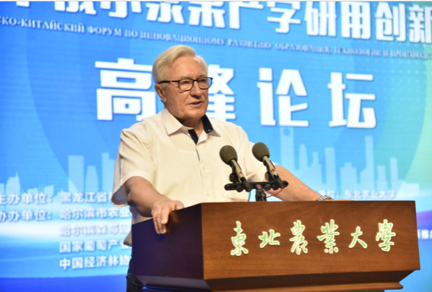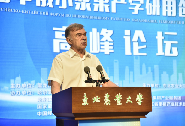 俄罗斯科公司远东分院副经理拉林·维克多·拉夫连基耶维奇院士致辞,他表示中国在世界农业领域举足轻重,俄罗斯远东地区与黑龙江省在农业方面有很强的互补性,期望两个地区加强包括小浆果产业在内的多个领域的合作。