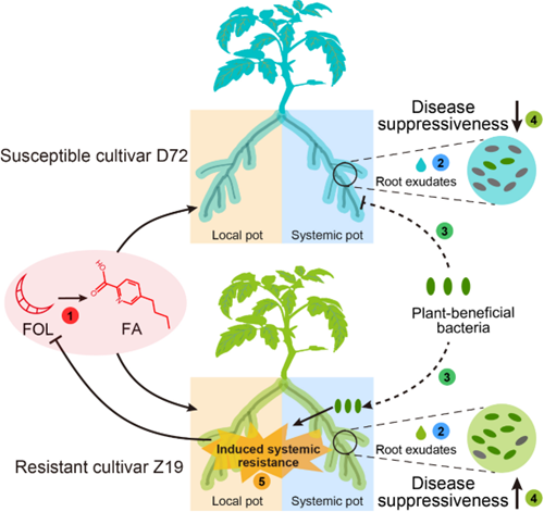 土传病原菌是危害农作物生产的重要因子,限制了农业可持续发展。受到病原菌侵染后,植物会选择性招募根际有益微生物增强自身适应力;同时,土传病原真菌能通过分泌毒力因子直接抑制根际有益微生物,从而利于其侵染植物。但是,植物-土传病原真菌-根际微生物组的三者互作关系尚不清楚。本研究发现番茄的枯萎病抗病和感病品种受到枯萎病菌侵染后对根际有益微生物的招募存在差异。番茄枯萎病菌产生的次生化合物镰刀菌酸能引起番茄根际微生物组系统性的变化。镰刀菌酸抑制了感病品种招募高效根际有益细菌,但促进了抗病品种招募这些根际有益细菌。进一步研究发现,枯萎病菌和镰刀菌酸通过改变番茄根系分泌物而影响了番茄对特异根际有益细菌的招募。该研究进一步阐明了植物-土传病原真菌-根际微生物组互作影响作物健康的机制,也为构建健康根际微生物组提供了思路。